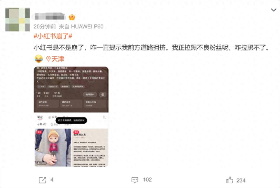 今天中午,有博主称小红书崩了,平台一直提示“前方道路拥挤,请稍后再试”。