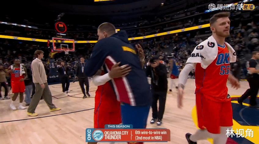 虽然输了球,约基奇还是和雷霆球员逐一拥抱后,这才退场,很有风度。