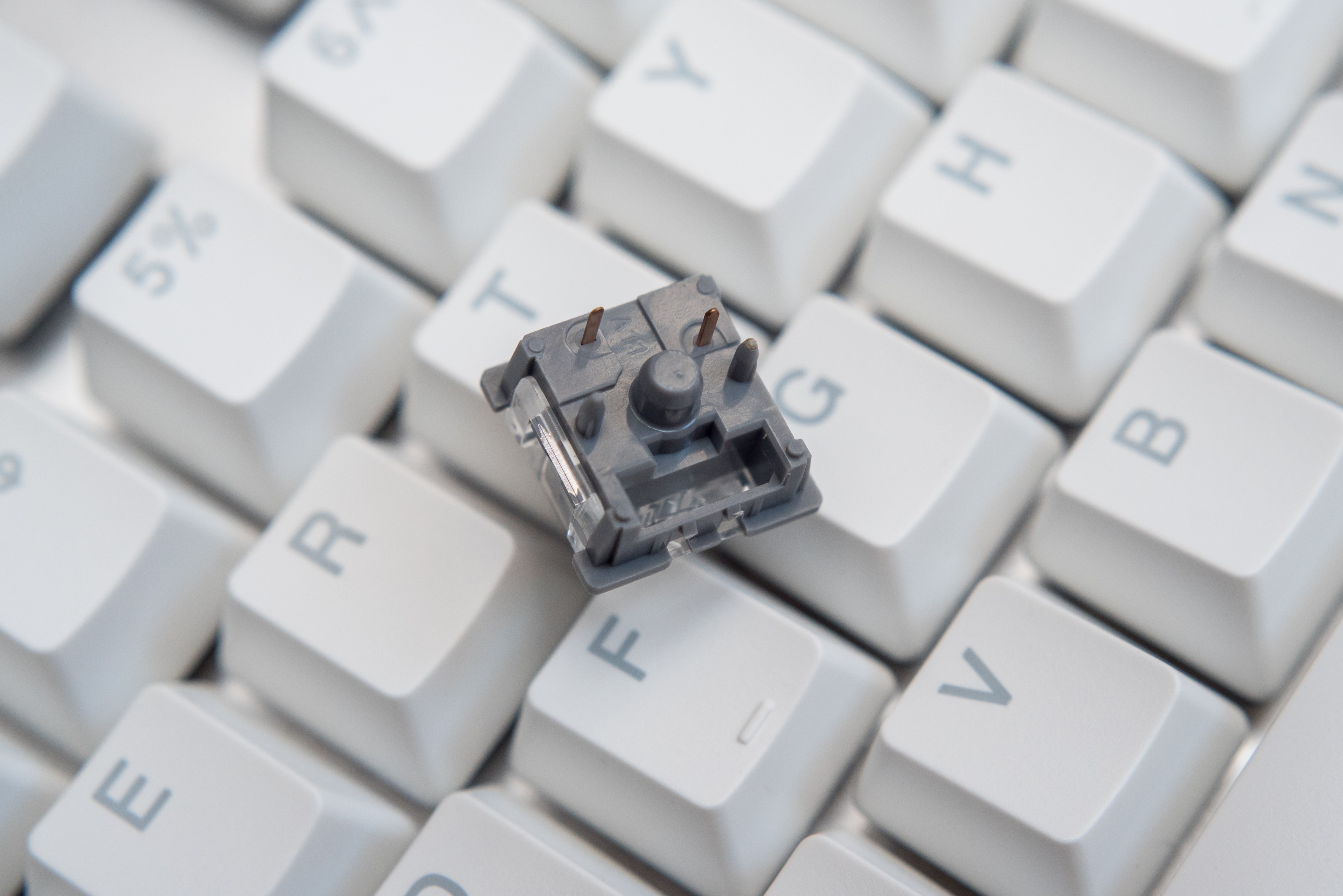 ▼轴体可使用附赠的拔轴器轻松拔出方便玩家自行替换其他手感的轴体,同事雷柏也提供了自家研发的线性弹白轴作为替换的选择,不看纸面数据单凭个人手感,感觉线性弹白轴比快银轴触发更灵敏,触底后的声音比快银轴更加厚重