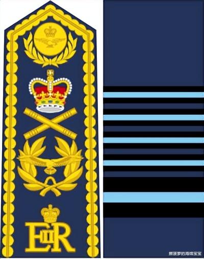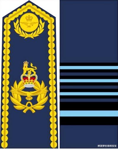 空军少将(Air Vice Marshal):标志为一条粗黑色中间浅蓝色条纹和一条细黑色中间浅蓝色条纹。正式礼服肩章和空军上将一样。海外活动礼服肩章为金色的一粗一细条纹。