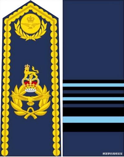 空军上校(Group Captain):标志为四条细黑色中间浅蓝色条纹。海外活动礼服肩章为金色的四条细条纹。