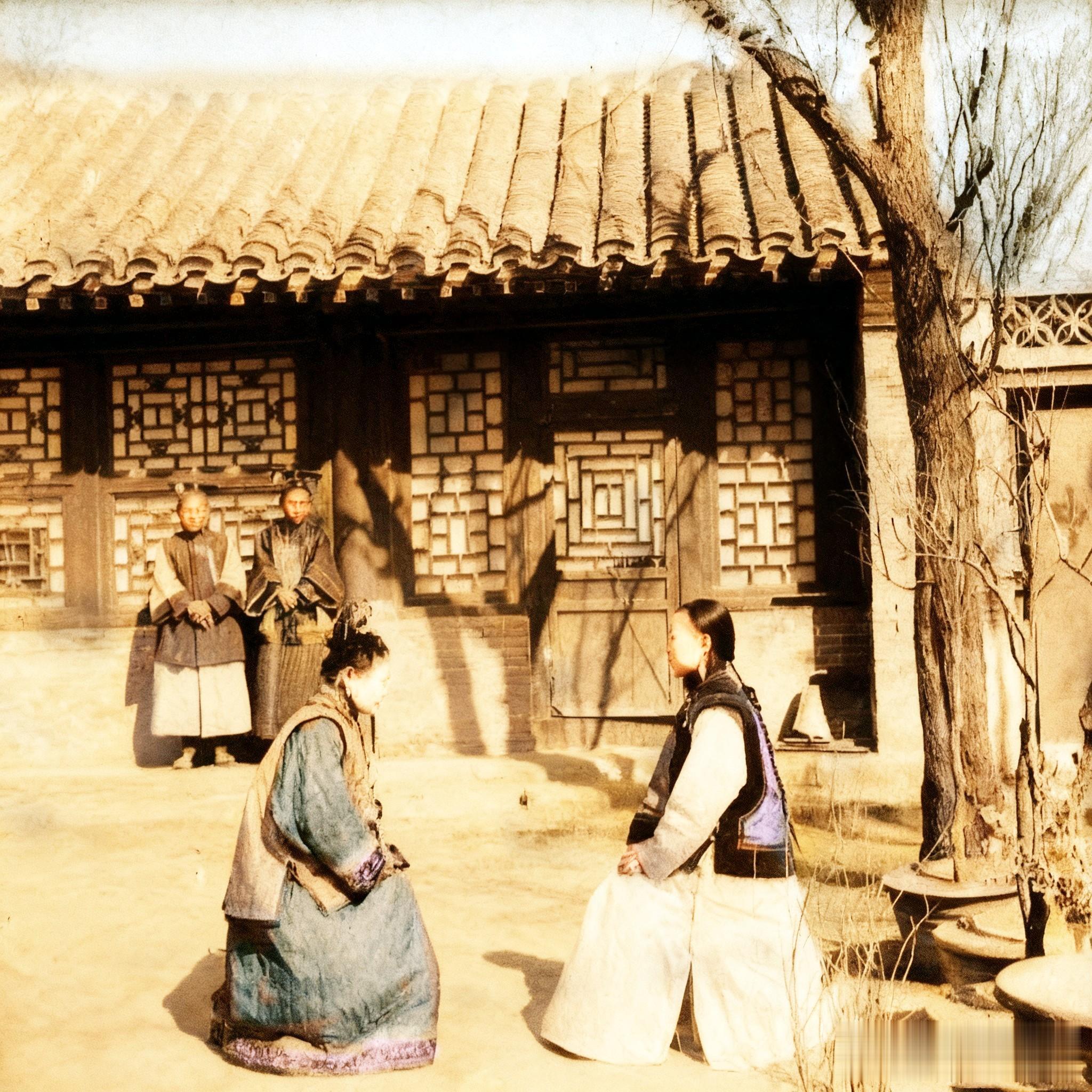 两名满族女子在院子里展示彼此见面时的请安礼节。女子双腿并拢,身体下蹲,双手扶膝,头微低,动作恭敬。两个老年奴仆远远地站在屋檐下,保持着同样的姿势,这大概就是当时旗人嘴里的“规矩”。