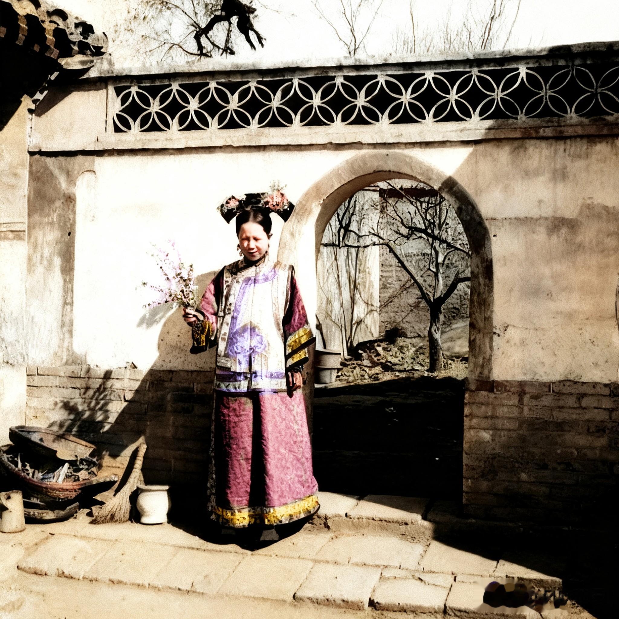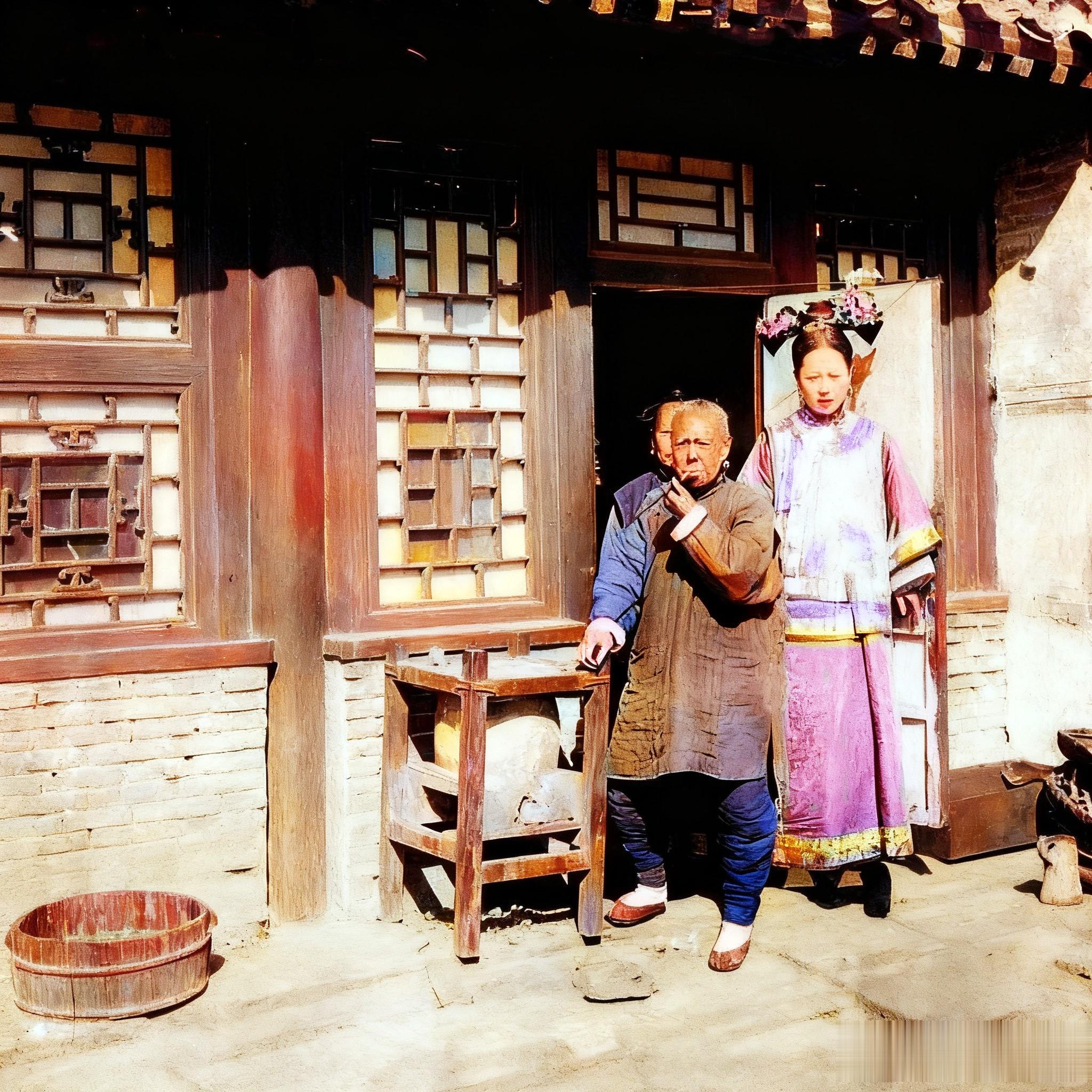 拱形门内是下人住宿的院落,衣着华丽的年轻姑娘站在下人的房门前,可以看到老妈子也是一名满人,穿着粗布衣服,嘴里叼着烟杆。