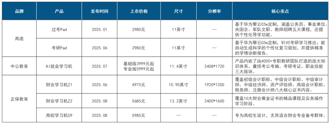 比较典型的有,高途发布考研Pad,中公上线AI就业学习机、正保会计网校推出正保财会学习机等等,这些特定领域的专用学习平板产品反映了其应用市场从K12向全生命周期的延伸。