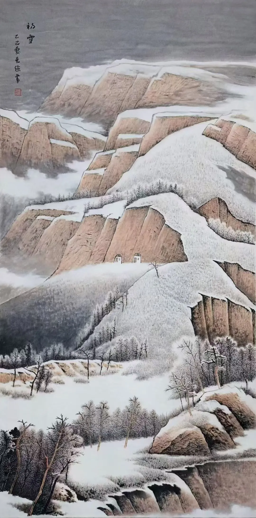 在赵克俭看来,传统是根本,是源泉。“只有认真学习传统,作品才扎实、不虚华。”他深受宋代范宽、李唐等大家影响,追求“宁静肃穆,没有一点躁气”的境界。同时,他也汲取近现代徐悲鸿“艺术唯美”、李可染“用最大的功力打进去,用最大的勇气打出来”等理念,使古老的山水画在现代语境中焕发新生。他的作品《古塬雪韵》《春山访友》等,不仅技法纯熟、笔墨清润,更在构图、色彩、光影等方面融入现代审美意识,呈现出“传统中蕴含时尚”的独特风貌。画面中山川俊朗、云水氤氲,既有古典的静谧,又有现代的张力,仿佛一首首视觉化的诗,引人入胜。