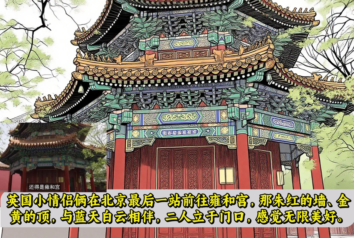 最后前往雍和宫,那朱红的墙、金黄的顶,与蓝天白云相伴,二人立于门口,足足看了好一阵儿。