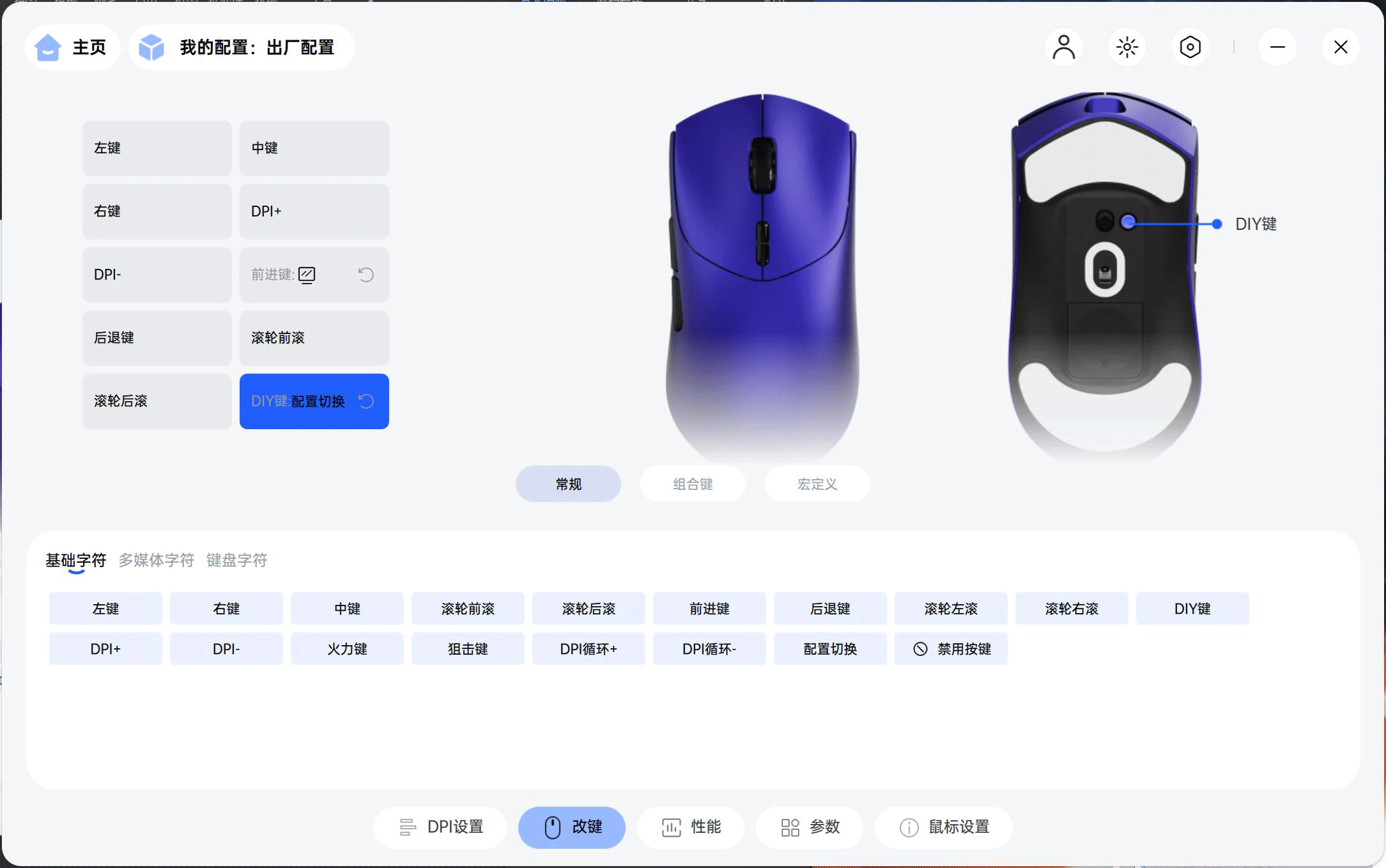 鼠标一共设置有10个按键,通过软件可以对10个按键全部进行自定义的设置,赋予每一个按键不同的点击功能。底部的紫色按键为隐藏式DIY按键,可以设置成比较特殊一些防止误触的按键定义。