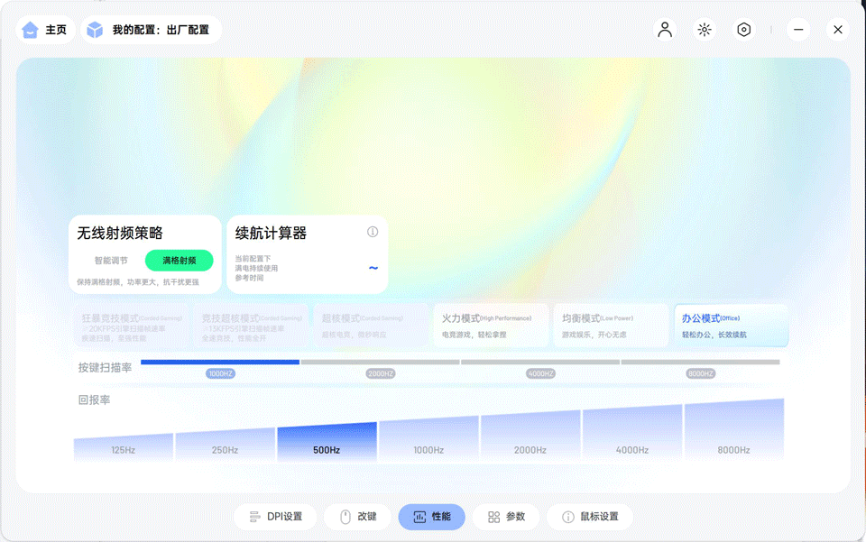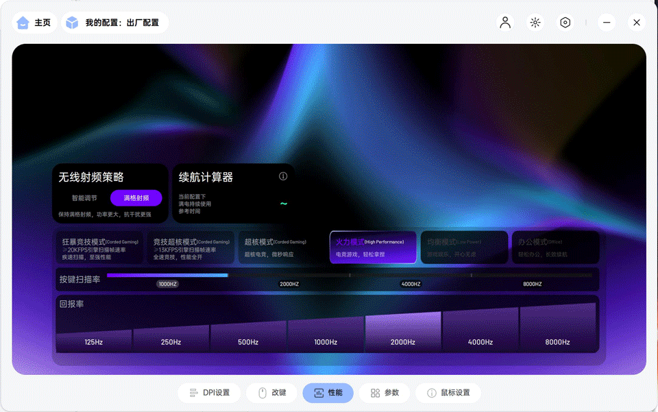 软件的性能和参数项同样是非常重要的设置选项,可以调节鼠标的运行模式,在办公、均衡、电竞之间自由切换,可以满足不同用户群体的各种使用需求,比如电竞模式就包括:狂暴竞技、竞技超核、超核、火力,对游戏玩家极其的照顾。让技能释放更跟手,游戏操作零失误。