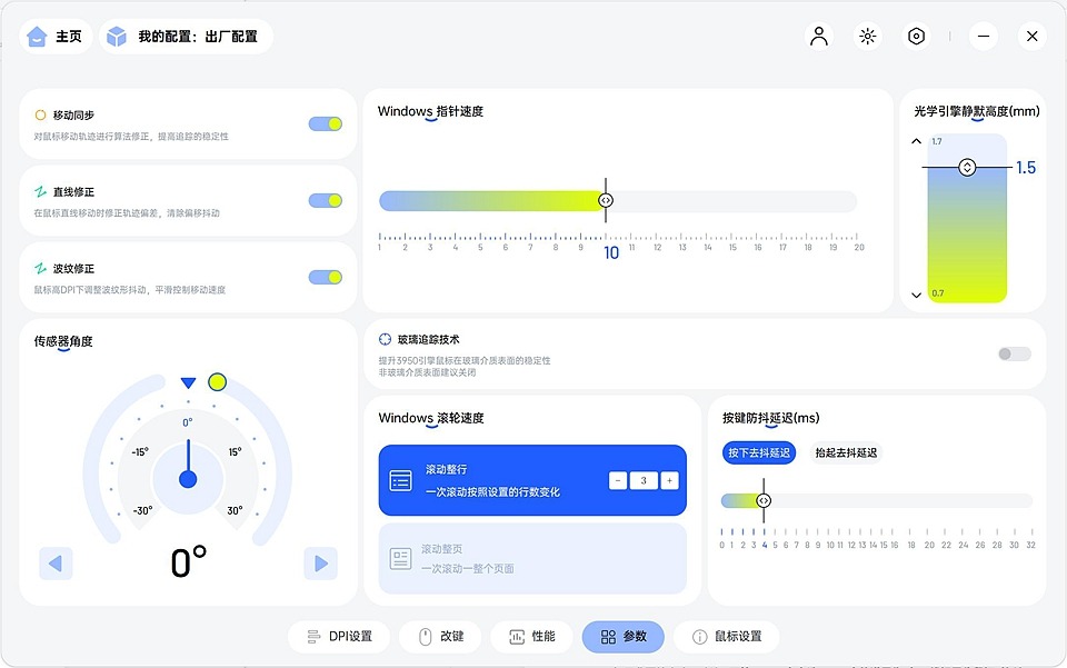 参数项的设置我认为就相当于给鼠标纠偏的设计,内部众多的设置选项其实不需要我多做介绍,你看到软件的设置界面也会一目了然,完全不需要去深入了解就能明白各项设置的含义,对鼠标的基础参数进行补偿调整的设置,以满足不同使用环境/场景下的使用需求。