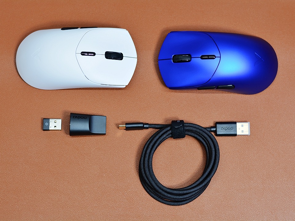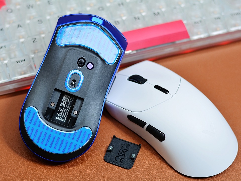 笔者分别使用黑白色版VT7,夜光蓝色版VT7MAX来做体验,雷柏VT7与VT7MAX均沿用VT系列一贯的流线型设计,两者外观细节没有明显的差异,唯独MAX版在侧面标注了MAX字体logo,这也就是在外观上两者唯一的不同了。