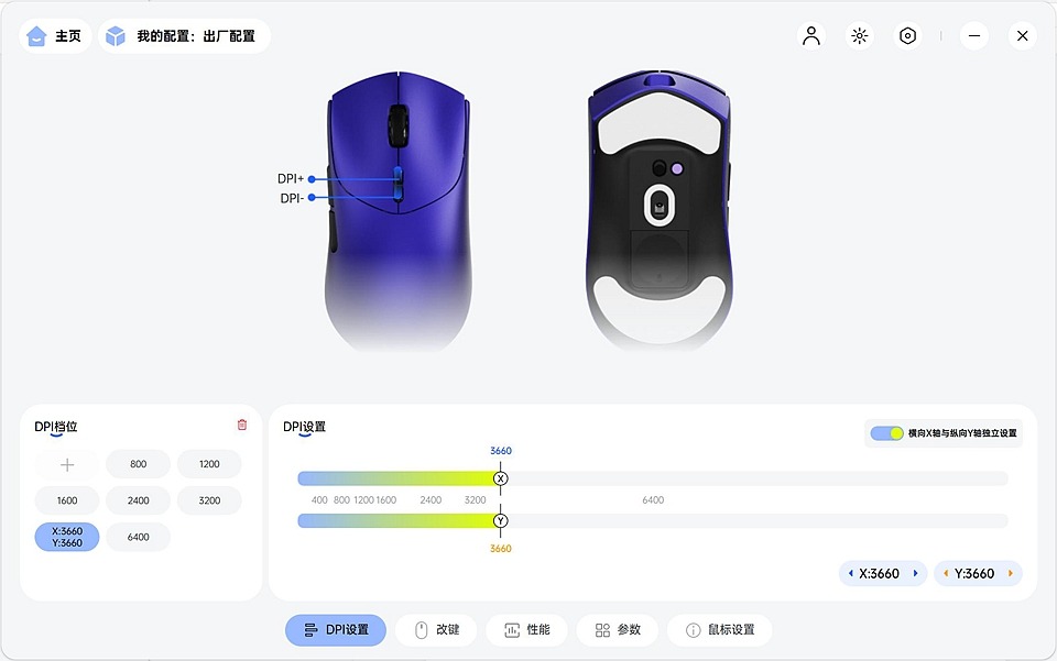 通过软件能够很直观的看到鼠标的电量情况,可以随时掌控鼠标电量情况。鼠标的DPI设置里其实设置不足为奇,但是有一点横轴X和纵轴Y可以独立进行设置。