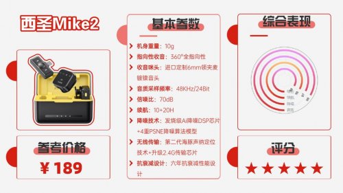 西圣多年来坚持“发烧级”产品理念,致力于打造音质卓越的麦克风。西圣Mike2采用加强版全指向AI感知麦克风,内置高品质进口定制6mm音头,搭配32位浮点数DSP芯片,配合4重PSNE降噪算法和自研RS™反馈抑制技术,实现98%的声音清晰度和96%的抗噪性。研发阶段,西圣邀请3000多位用户进行音质测试,确保产品性能卓越。因此,西圣Mike2堪称“百元级无线麦克风天花板”。