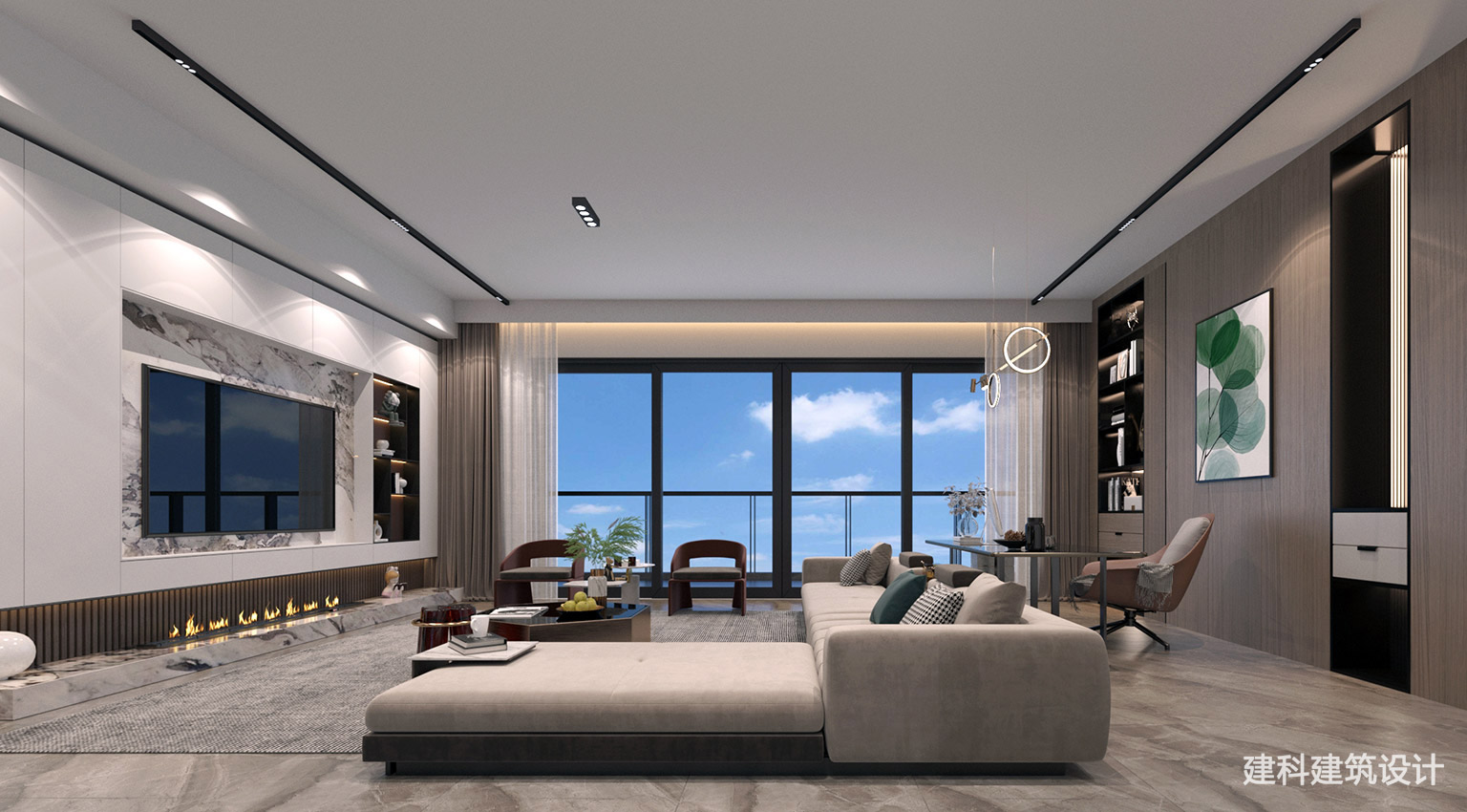 浅杏色沙发揉进暖光里,大理石电视墙的肌理撞着木饰面的温软,这不是样板间,是你推开门就能接住的松弛感。悬浮吊顶藏着线性灯的温柔,背景墙的氛围光裹着装饰壁炉的暖调,连嵌入式柜体都把收纳做成了展陈级的精致;落地窗外是整片蓝天当画框,把 “在家看风景” 变成日常标配。从光影层次到材质细节,把“高级感”揉进每一处落脚的舒适里,这才是进阶生活该有的样子。