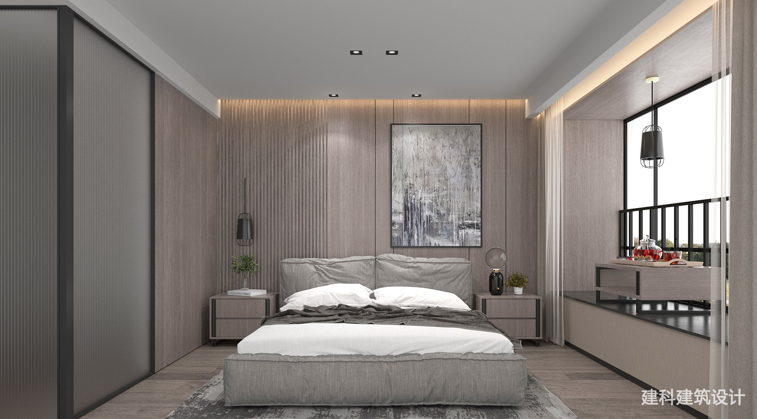温润浅木饰面铺满整个私域,竖向肌理墙板揉进光影层次,暗藏的柔光灯带一启,连空气都裹上了软乎乎的暖意。软包大床裹着低饱和灰调,悬浮床头柜轻简不压场;冷调艺术画晕开质感,恰好中和木调的暖。窗边偷出一方茶歇角,晨光裹着风钻进来时,连发呆都成了日常里的小奢侈。没有冗余装饰,只有妥帖松弛,这才是主卧该有的样子:既是卸下疲惫的缓冲带,也是藏着质感的自留地。