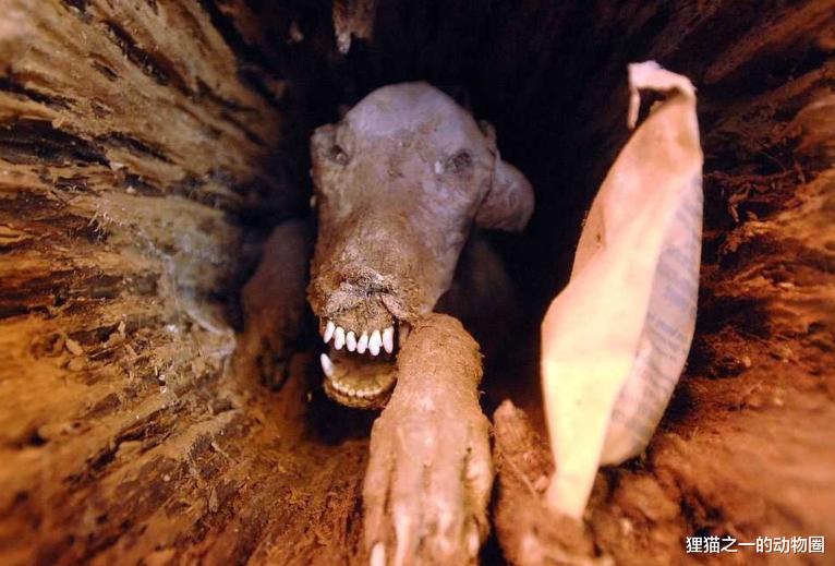 从原木的前端可以看到斯塔基的前腿、头和前肩,以及上背部的一小段项圈的残留。它的两条前腿一前一后伸着,周围的木头上布满了深深的抓痕,显然可怜的斯塔基曾经进行了疯狂痛苦的挣扎。它的嘴巴张开着,露出了一口的獠牙,可能是木乃伊化后嘴唇收缩导致的,也可能是死前正在大口喘气和嘶吼。