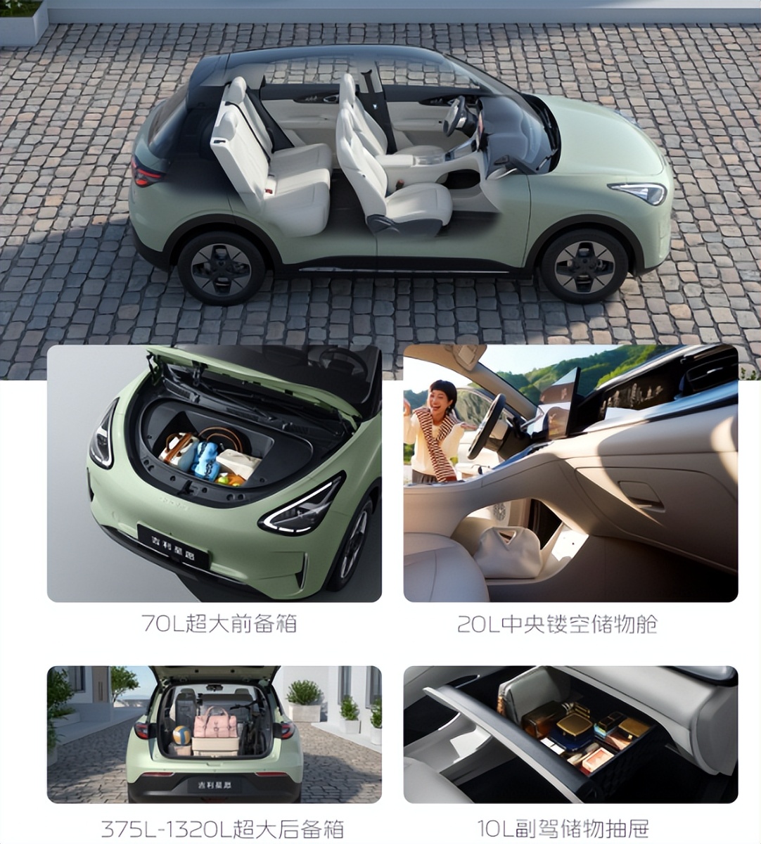 储物设计的巧思是星愿打动家庭用户的关键,堪称小型纯电的“空间魔术”。70L独立前备箱专门为20寸登机箱、充电枪等物品开辟了收纳区,彻底解决了传统纯电车型“前舱闲置、储物杂乱”的痛点。全车更规划了36处分散储物空间,中控台镂空层、车门储物槽、后排座椅下隐藏盒等细节,让手机、水杯、儿童玩具等小物件各归其位。搭配375L常规后备厢,放倒后排座椅后可拓展至1320L,能轻松容纳露营帐篷、婴儿车甚至小型家具,家庭出行、户外露营、日常采购等场景全适配。