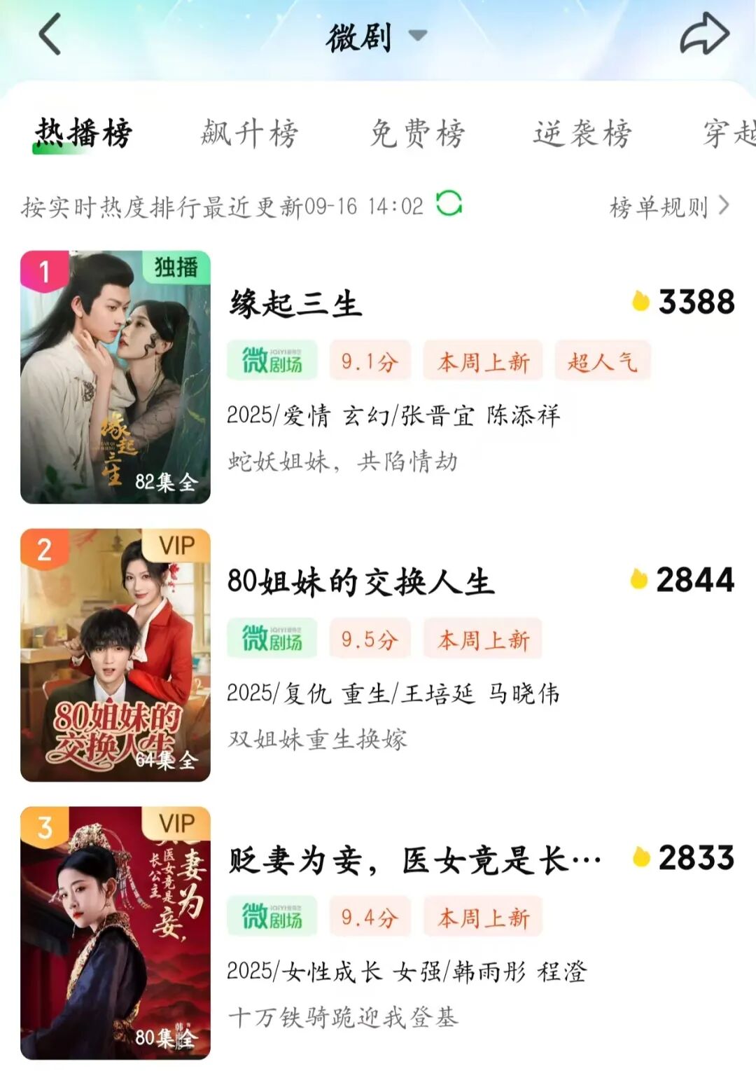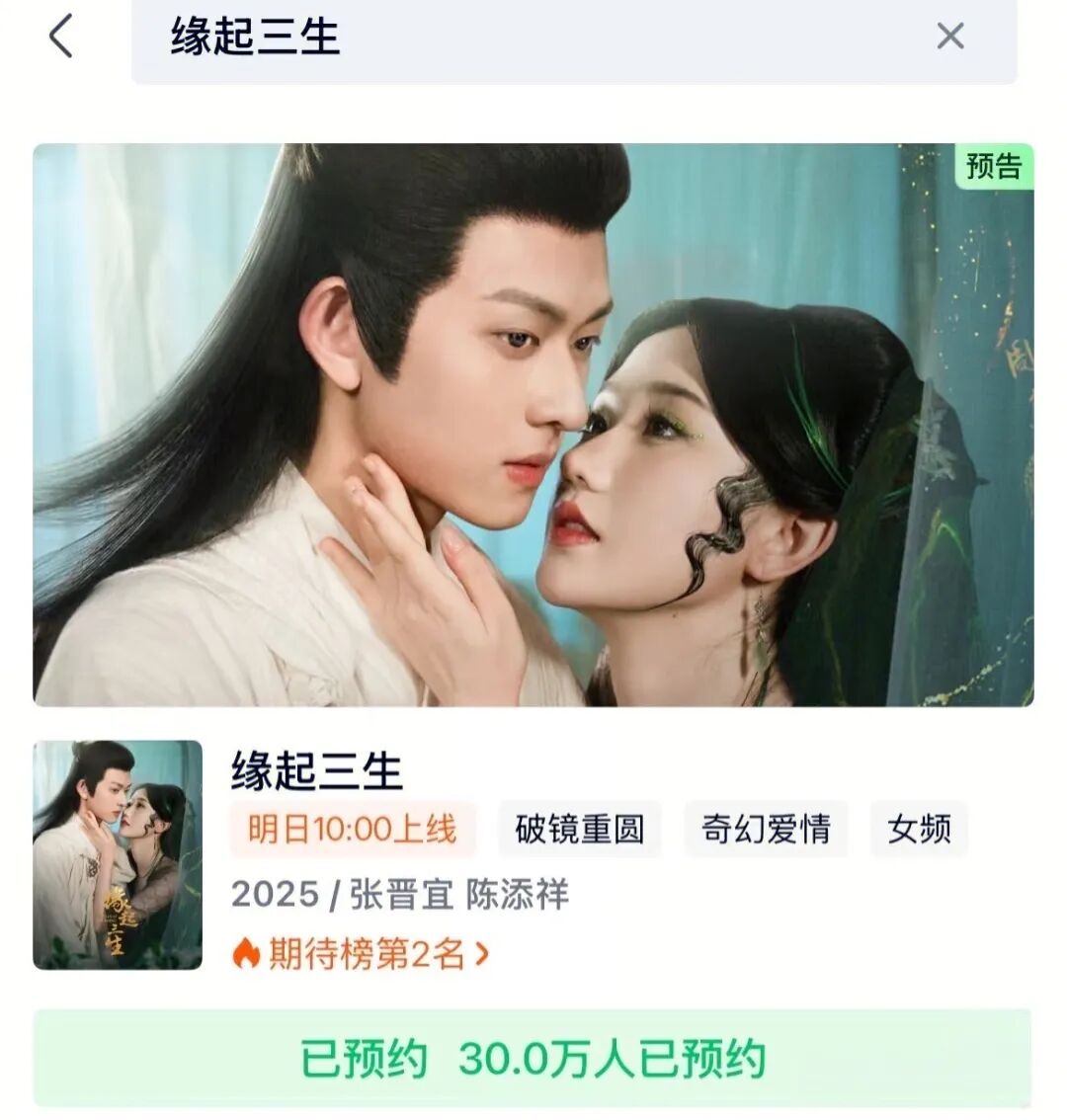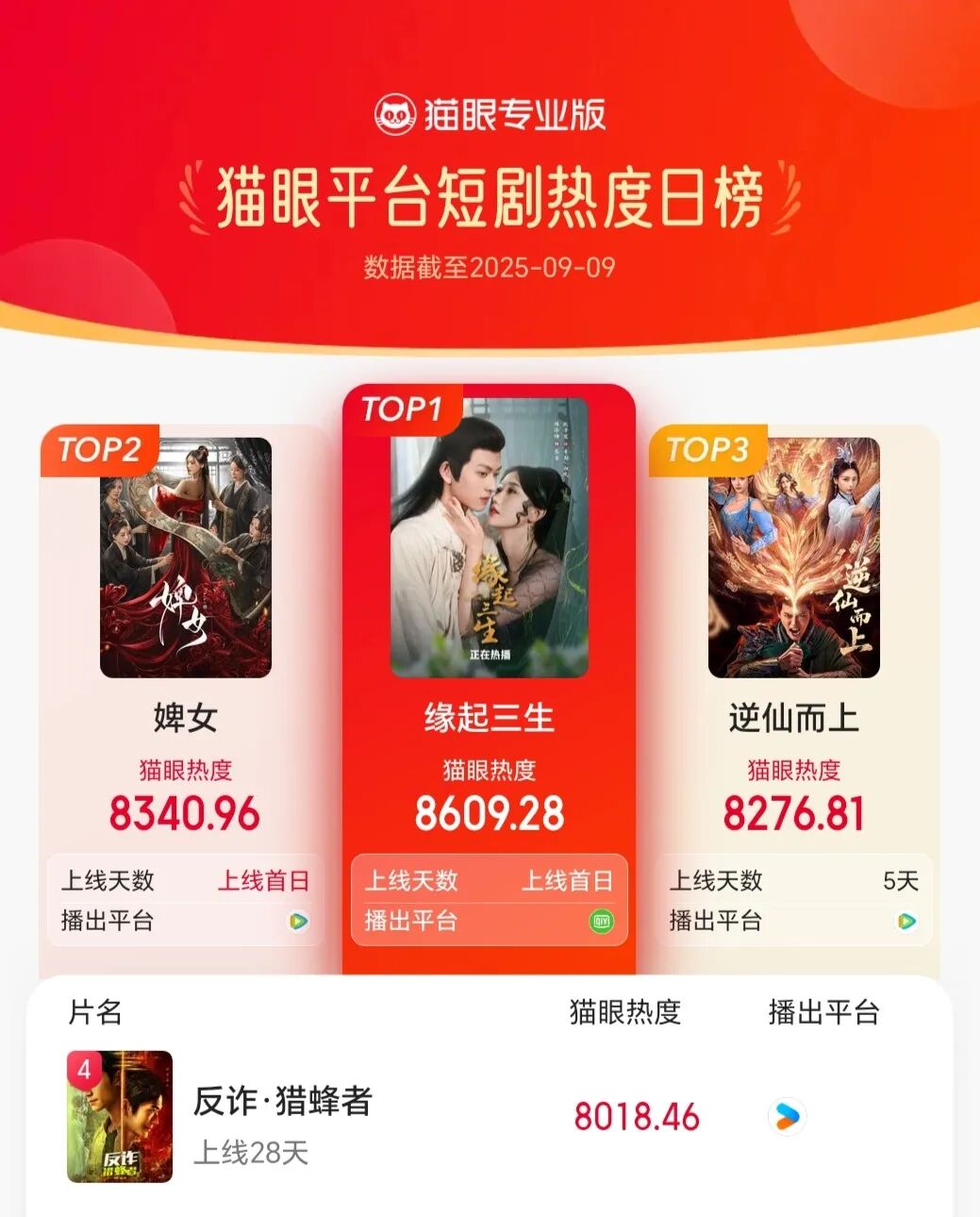 由陈添祥、张晋宜主演的竖屏短剧《缘起三生》于9月9日在爱奇艺独播,开播首日,直接登顶猫眼平台短剧热度日榜。截至目前,它在爱奇艺站内历史最高热度为4579。