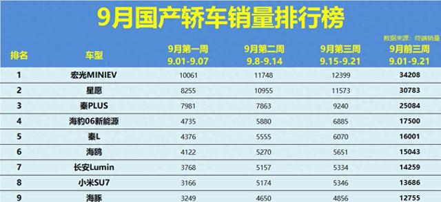 2025年9月国产轿车销量前三周数据出炉,市场呈现"哑铃型"分化: