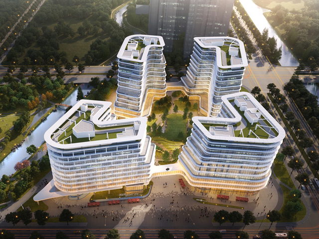 功能分区及设施综合服务中心为双廊式V形平面,兼顾经济实用的同时,大部分房间充分面对最佳朝向和景观面。其他塔楼以V形为母体,两翼为主要使用空间,中部结合空中休憩连廊,形成大尺度中庭,有效改善了室内自然采光与通风,成为共享与互动的重要场所。