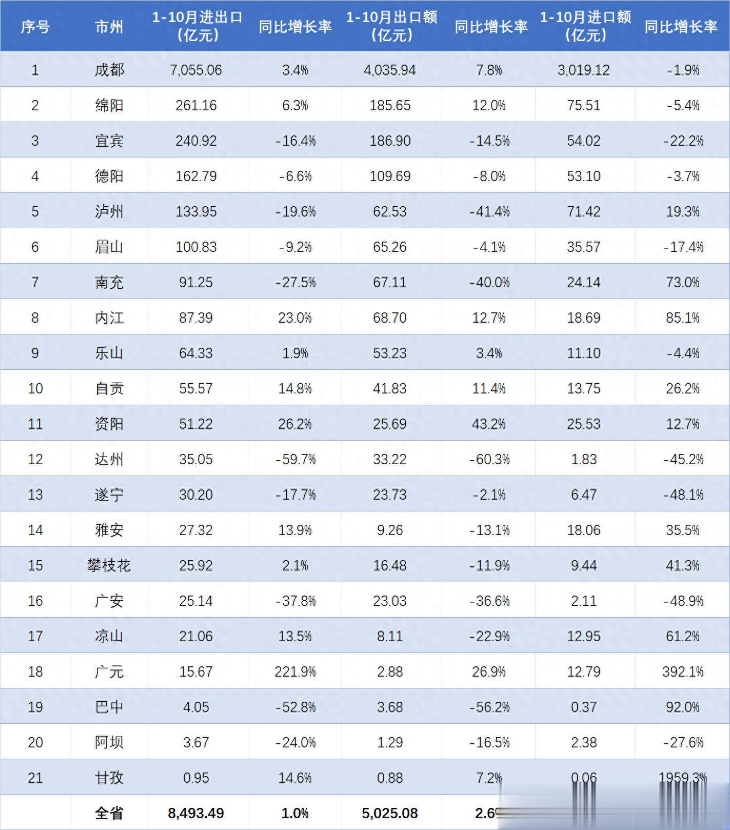 四川省各市州2025年1-10月进出口总额具体数据见下表: