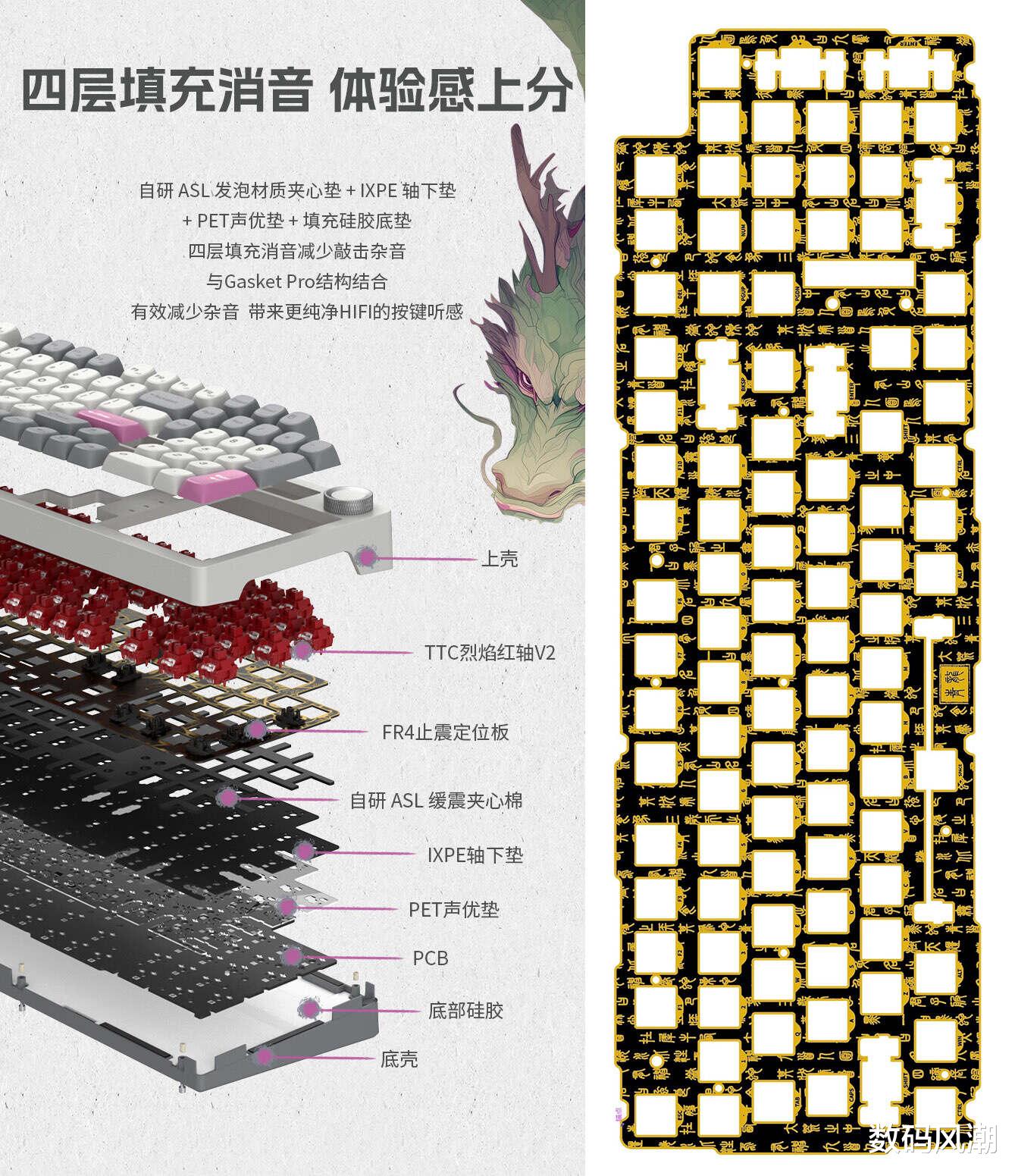 国风元素一直当下热门元素,只不过青龙没有用键帽大面积展示,而是藏在篆体PCB板之中。Gasket Pro结构对于消音减震都做了大幅增强,多层填充(ASL缓震夹心棉、IXPE轴下垫、PET声优垫、底部硅胶)将FR4篆文定位板与PCB分隔开,确实将良心用料发挥出SKN高性价比的卖点所在。