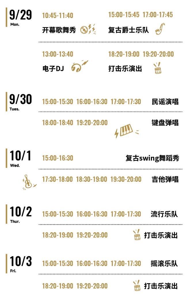 此外,新天地玩车节还将连续5天带来高达25场复古歌舞、电子DJ、摇滚乐队等沉浸式演出,黄金长假不必远行,在魔都市区收获假期潮流新玩法。