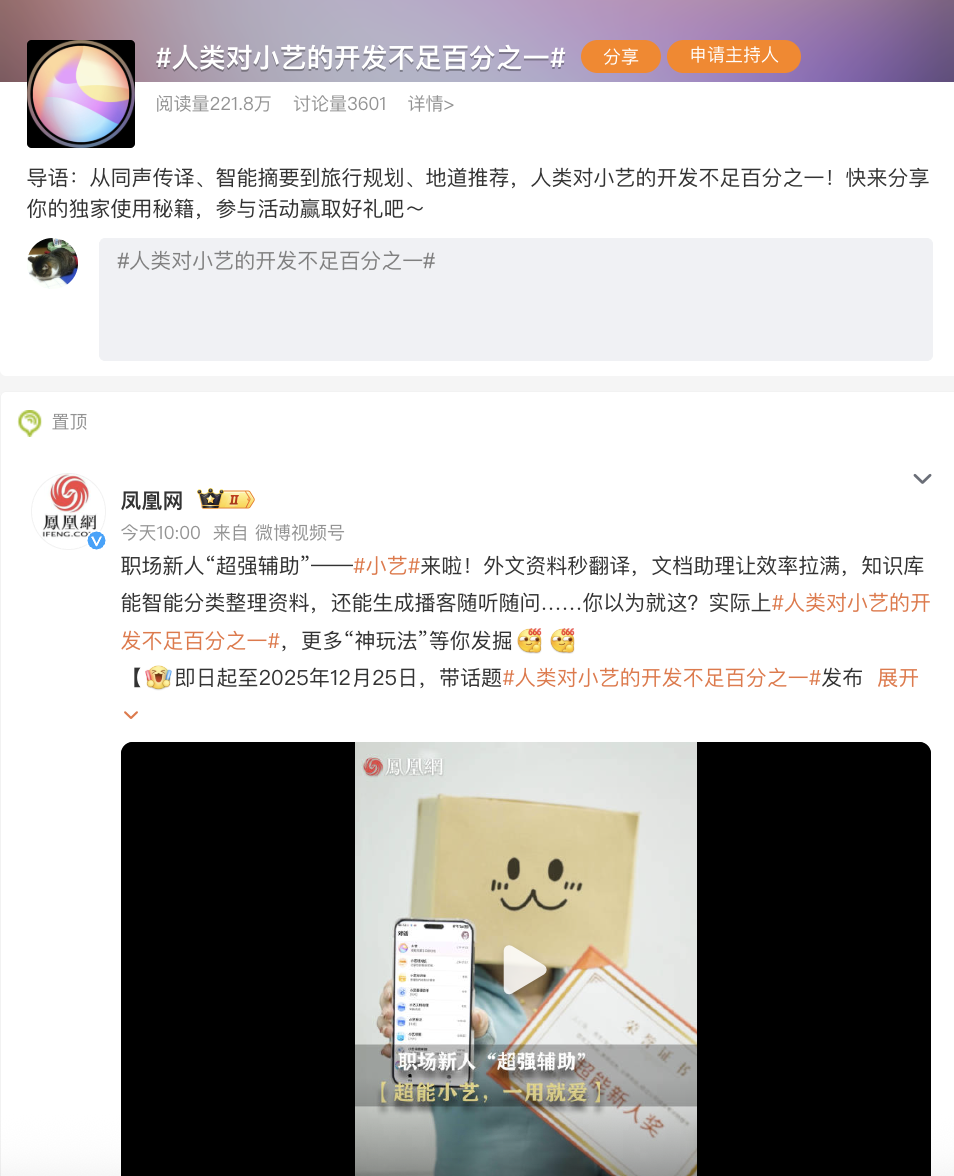 这不,最近凤凰网在微博等平台发起了#人类对小艺的开发不足百分之一#话题征集,喊着全网用户一起晒出自己和小艺的相处日常,不管是用小艺极限赶ddl的壮举,还是意想不到的离谱玩法,都可以来贡献一波灵感。