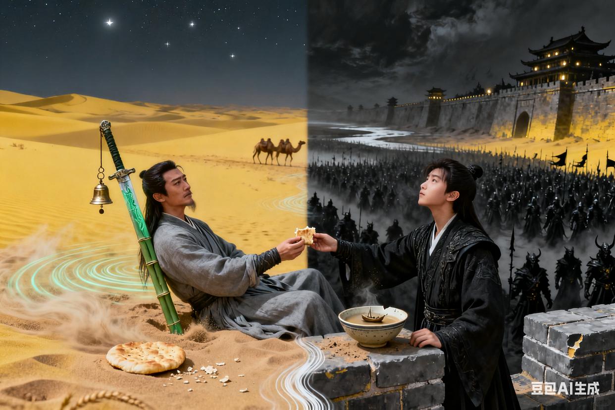 他靠在剑旁,从怀里摸出半块硬得像石的麦饼,咬一口,渣子掉在沙上,被风瞬间卷走。