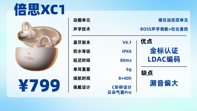 这款是第一款采用楼氏动铁的耳夹式,搭配BOSS声学调校,三频均衡自然,人声清晰通透,乐器分离度不错,还支持LDAC高清解码和杜比音效,声场开阔,沉浸感拉满!佩戴上云朵气囊设计柔软亲肤,久戴无压力,运动时也稳固不掉。不分左右耳的设计也很贴心,随手一戴就能用。而且续航也长,不用频繁充电,还支持IP57防水防尘,整体各方面表现都很不错。