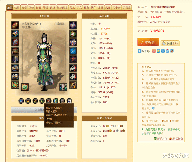 先看面板:血量147万,蓝量8.7万,命中11.8万,闪避3.7万,会心攻击2785,会心防御628,主毒攻击25204,减杜康1439!