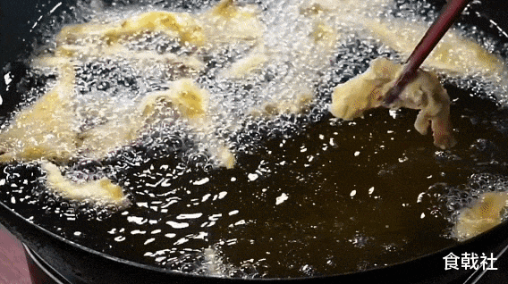 7.炸到蘑菇飘起来,中途给它翻两次面,炸至两面金黄,就可以捞出控油了,全程中小火慢炸也就四五分钟。