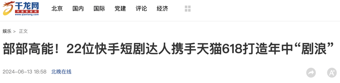 6月13日,据《北晚在线》报道,“6月5日—6月15日,快手星芒短剧上线22部由天猫独家冠名的精品短剧。作为星芒短剧与天猫的整体性合作,项目首次推出达人矩阵品牌合作短剧,涵盖青春励志、家庭共情、都市职场、国韵古风等题材,在满足观众娱乐需求的同时,将多元助力天猫618年中狂欢节强势曝光及高效转化。”