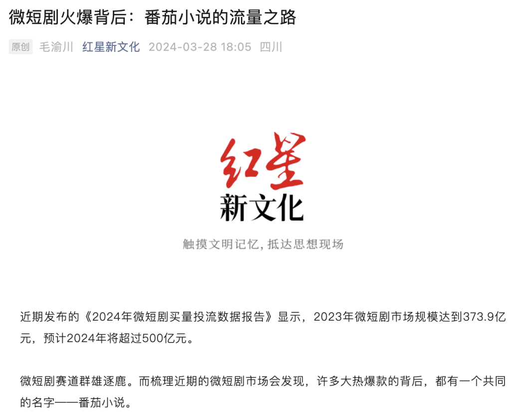 据《红星新文化》今年3月28日报道,“梳理近期的微短剧市场会发现,许多大热爆款的背后,都有一个共同的名字——番茄小说。”