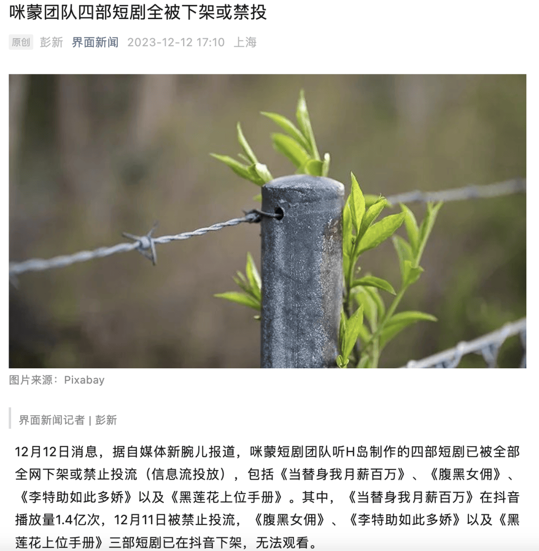 据《界面新闻》2023年12月12日报道,“咪蒙团队四部短剧全被下架或禁投”。其中,改编自番茄小说IP的《黑莲花上位手册》正在此列。该报道称,“《黑莲花上位手册》成为短剧资本热潮爆发以来,受到监管收紧影响的典型案例。”