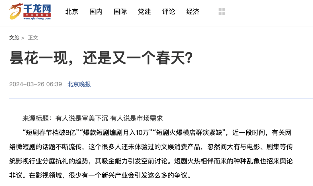 当时,该报道评论称,“无论短剧APP的盈利模式是靠用户充值,还是靠观看广告免费解锁,抖音都在进行双线布局。”