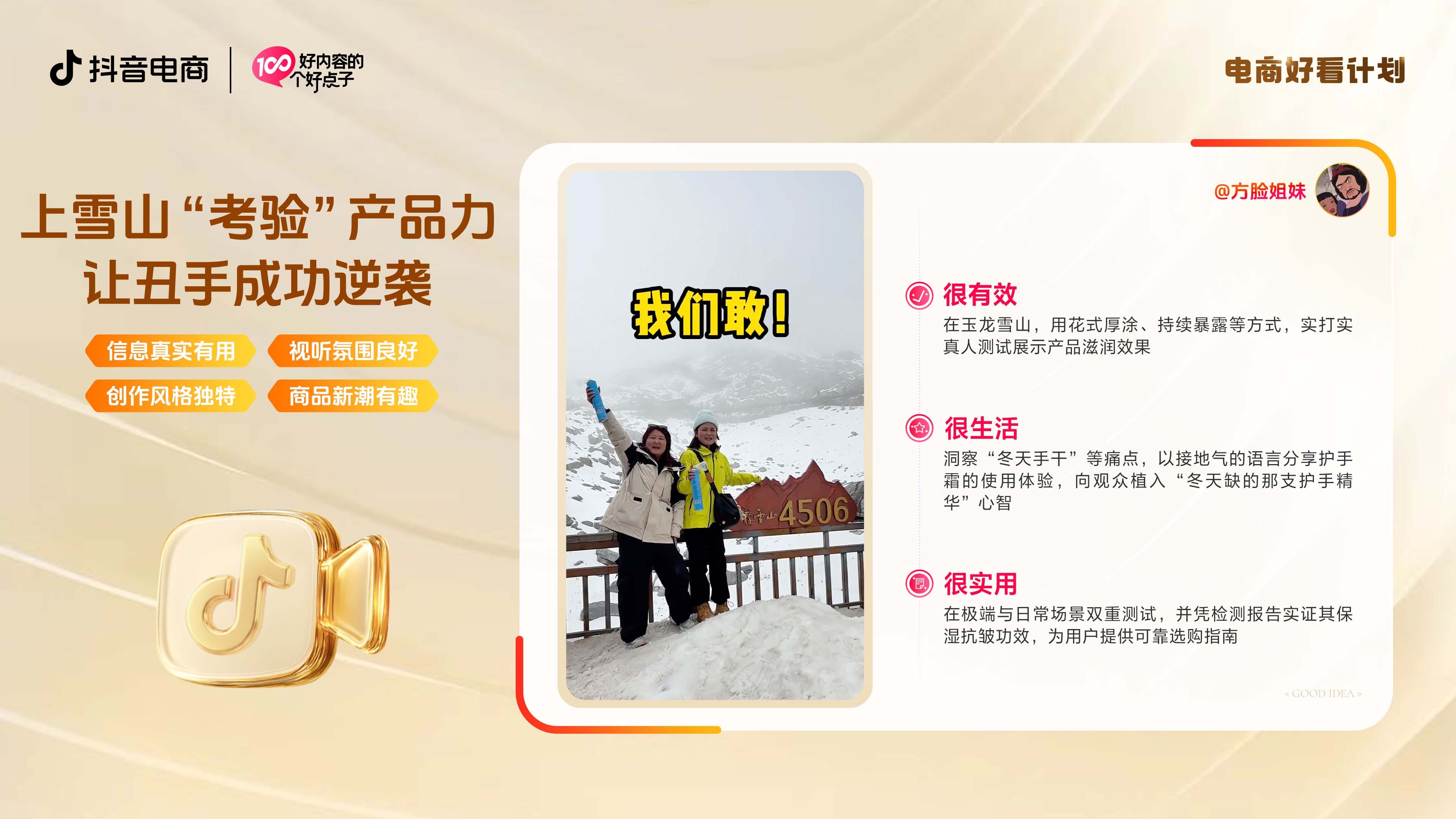 以 @方脸姐妹 为例,她们将护手霜测评“玩”出了真实感。在玉龙雪山的极端低温下,用雪冻手后户外厚涂,实打实测试产品的滋润与防护力,验证其“有效”。镜头一转,又回归到“冬天手干”的日常生活场景,用接地气的语言分享使用体验,自然建立“冬日必备手部精华”的场景化心智。更以权威检测报告为功效背书,完成从“眼见为实”到“信任下单”的完整说服闭环,让用户为一份看得见的安心感买单。