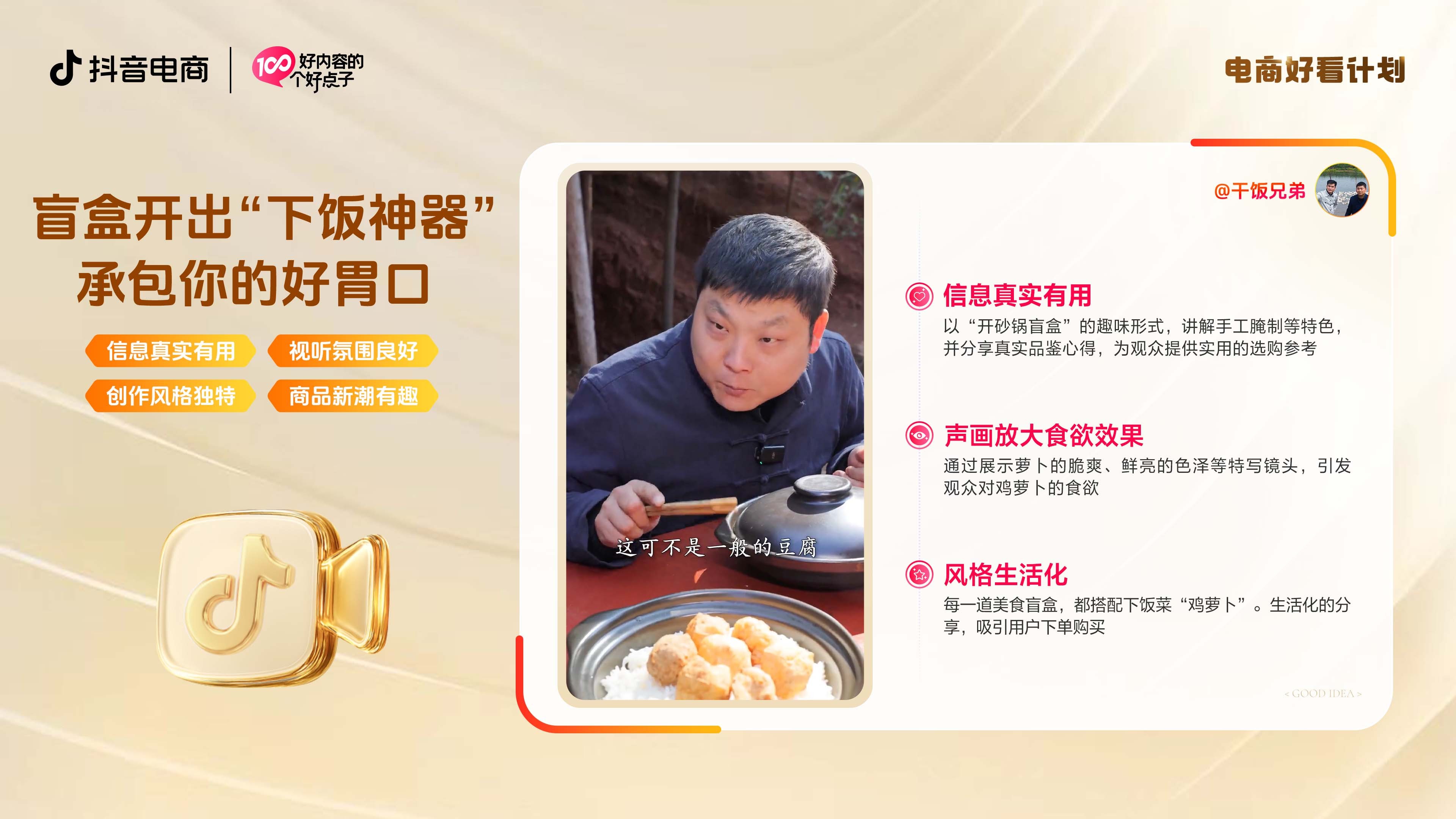 使用官方总结「食品电商好内容 = 信息真实有用 + 声画放大食欲效果 + 选品有要求 + 风格生活化」这一公式,便能做出让用户“看馋、看信、看下单”的好内容。