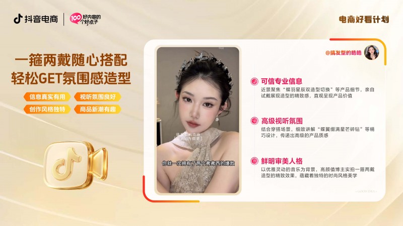 比如,作者@搞发型的皓皓在推荐发箍时,没有空谈设计,而是通过上头试戴展现造型的精致感,并直观对比佩戴前后的造型效果,让用户清晰感知发箍戴带来的优雅、灵动,降低用户尝鲜门槛。以特写镜头突出“蝶翼缀满星芒碎钻”的工艺细节,结合优雅灵动的音乐和超高性价比,激发用户购买欲望。