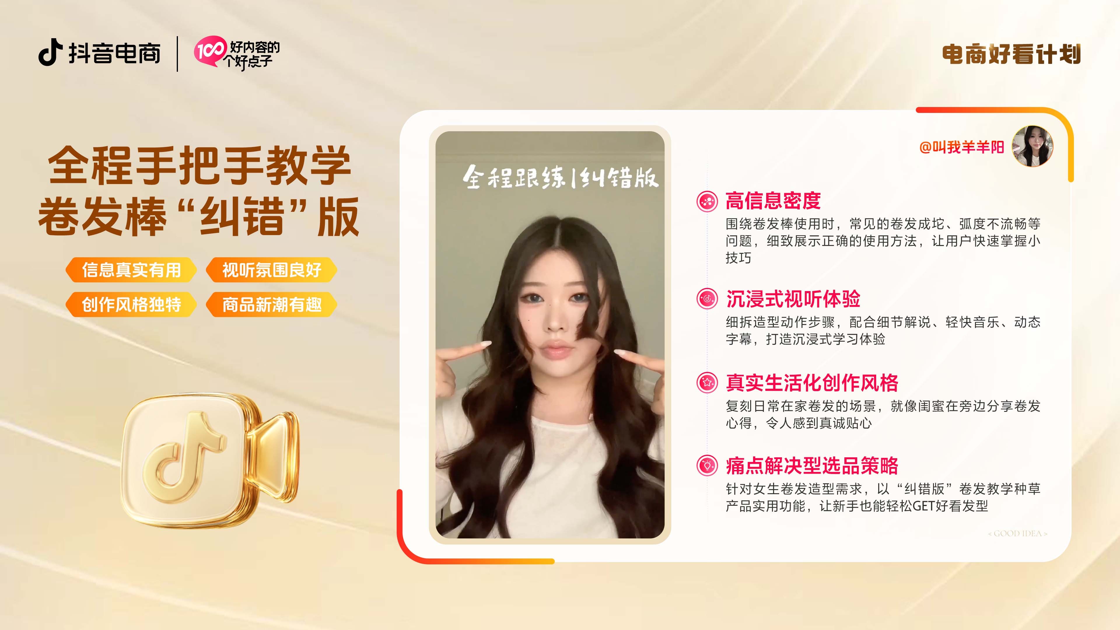 以@叫我羊羊阳为例,她直击新手“卷发成坨、弧度不流畅”的痛点,用“纠错教学”手把手拆解步骤,展示卷出理想卷发的办法;以第一视角镜头配上轻快BGM和细节字幕,让人像在看闺蜜现场演示,沉浸感拉满。全程复刻居家场景,用生活化的分享把“复杂工具”讲成“手残党也能搞定的造型神器”,从而打消用户顾虑,有效推动下单。