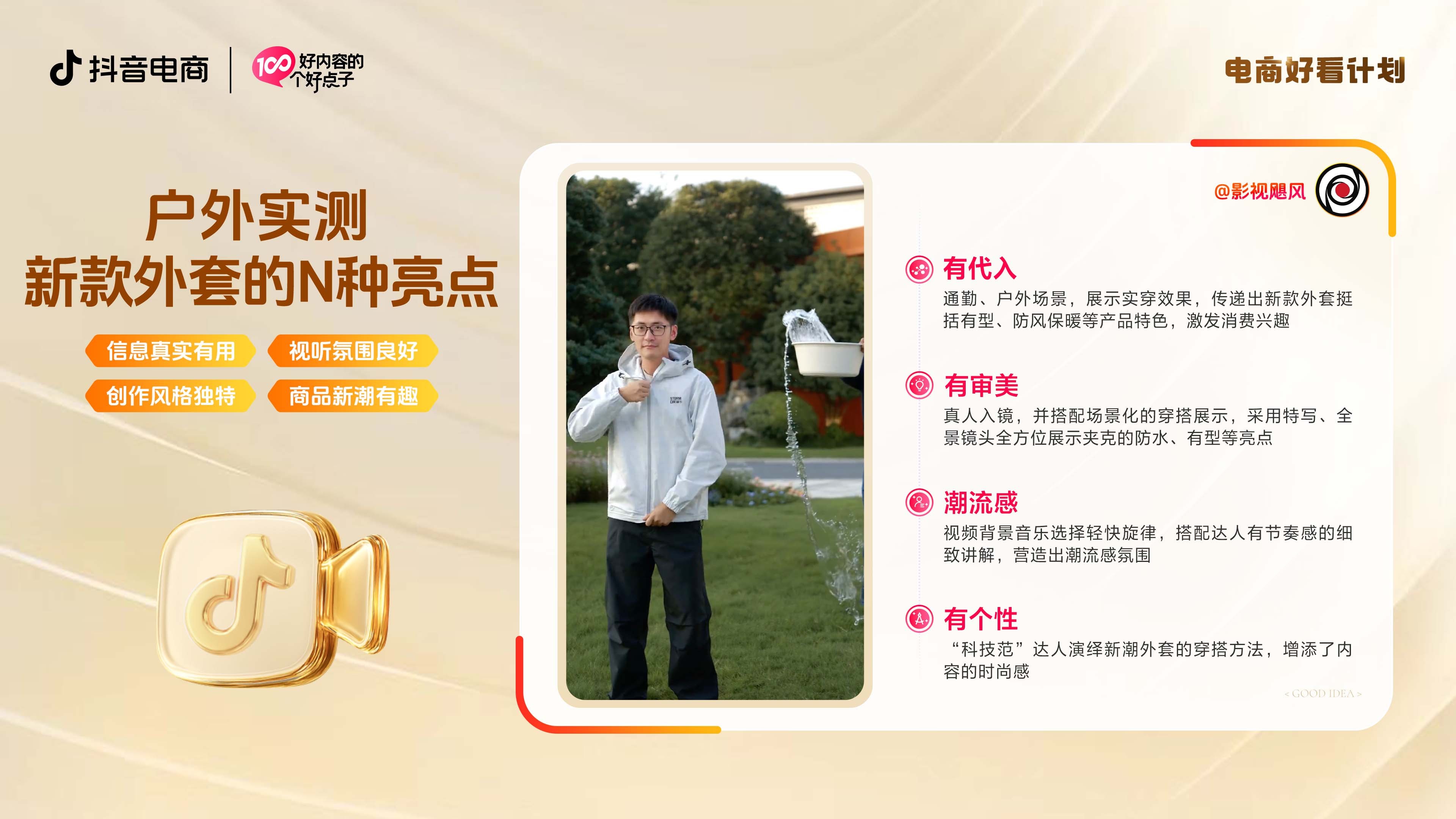 无论是融入二次元等热门元素,还是精心设计的原创短视频,爆款内容的诞生,从来不是偶然。为帮助更多作者系统掌握内容方法论,抖音电商升级「电商好看计划」,围绕“信息真实有用、视听氛围良好、创作风格独特、商品新潮有趣”四大维度,鼓励作者提升内容品质。平台以此甄选不同行业的抖音电商好看内容,将这些好看内容的好点子收录进「好内容的100个好点子」案例集,为作者提供可参考的灵感库。