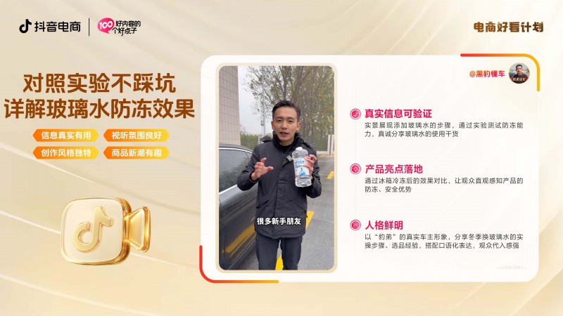 以@黑豹懂车为例,他以“豹弟”真实车主人设分享玻璃水干货,通过冰箱冷冻实验直观验证防冻性能,并结合第一视角演示增强代入感,成功将昆仑玻璃水“防冻、安全”的亮点,转化为用户“一看就懂、一用就会”的安心购买理由,快速转化目标用户。