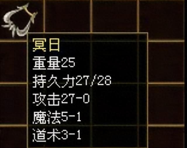 说实话,冥日这造型就够邪性的。通体暗红的刀身上盘着诡异的纹路,刀尖那颗紫色宝石闪着妖异的光,活脱脱就是为杀人狂魔量身定做的。更绝的是它的属性——0-27的物理攻击,还带1-5魔法和1-3道术,这在当年简直就是全能型大杀器。不过最要命的是它的隐藏属性:杀的人越多,威力越猛!这设定放现在估计要被喷成"破坏游戏平衡",可那时候我们玩的就是这个刺激!