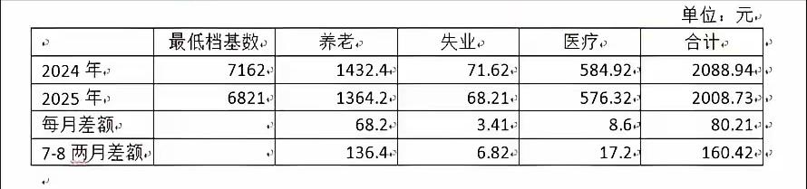 右耳远闻算了一笔账:以最低档基数参保的人,三项保险合计每月缴费是 2088.94元(养老1432.4元、失业71.62元、医疗584.92元)。相比去年标准的2008.73元,每月要多交约80.21元。