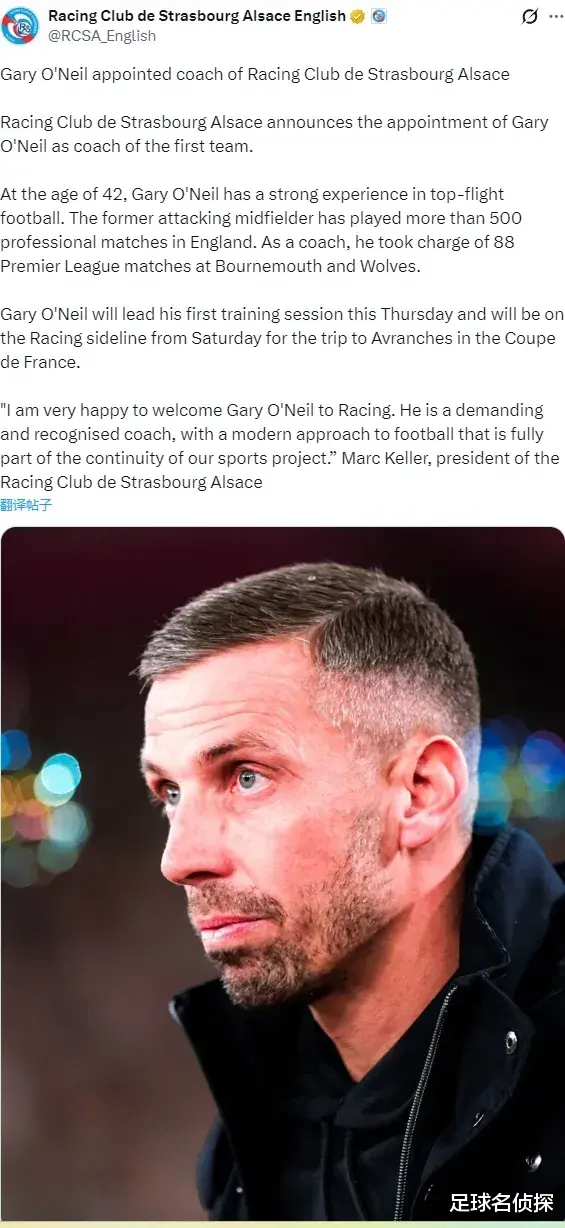 官方:斯特拉斯堡宣布任命加里-奥尼尔为俱乐部新主帅。