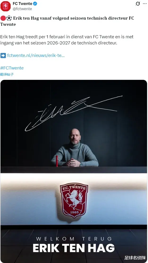 官方:前曼联主帅滕哈格被任命为了特温特队的技术总监。