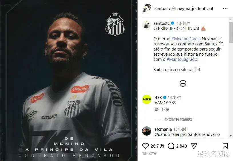 官方:桑托斯宣布和内马尔续约到赛季结束(12月底)。