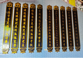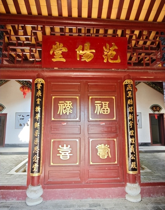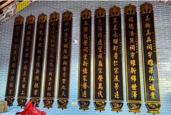 参观所见,进门照壁门框上方匾额是金色大字“范阳堂”,表明了宗族历史传承;照壁门扇正面篆书“福寿禄喜”,另一面是“富贵平安”,寄托了祝福期盼;照壁门柱悬挂金字行书对联“燕翼贻谋新宇煌煌义公殿,翚飞肯构华轩采采思念堂”(翚念hui,翚飞描述祠堂体貌如鸟振翼,肯构指愿意构建祠堂),以及主厅悬匾金漆字“永思堂”,感恩先祖对后代的庇佑,表达后代对先祖的深切思念。主神龛两侧对联是“祖德流徽奕代簪缨家声远,宗功衍庆千秋孝悌世泽长”,边墙神龛对联是“永承前业惟修德,思法遗规是读书”。这两联也是嵌字联,首字连读是“永思”“祖宗”,进一步深化理解永思堂之意。