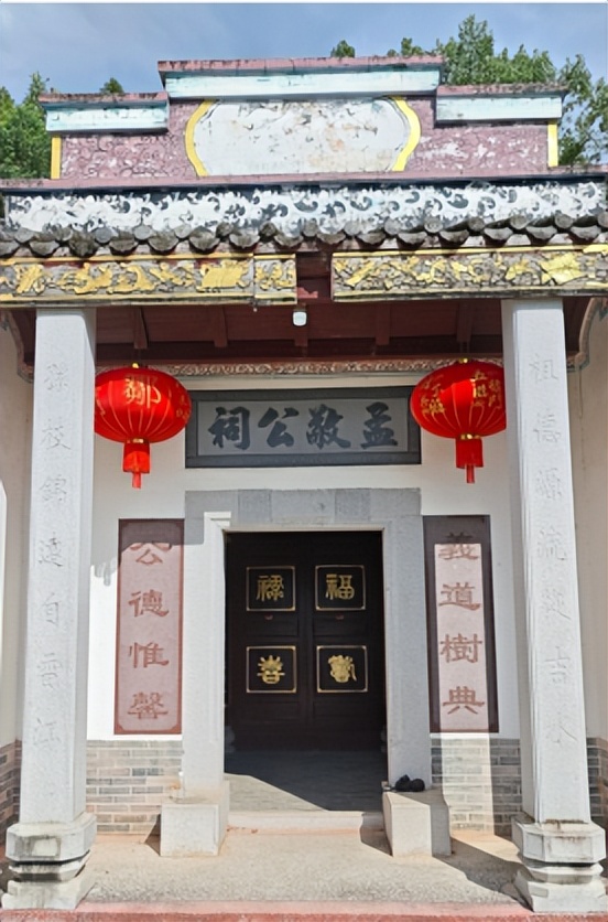 大门额头嵌石阳刻“孟敬公祠”(指邹孟敬,即邹义),大门左右嵌石阳刻对联“义道树典,公德惟磬”,左右首字连读就是“义公”(指邹义,即邹孟敬),对联赞扬义公道德堪称典范。