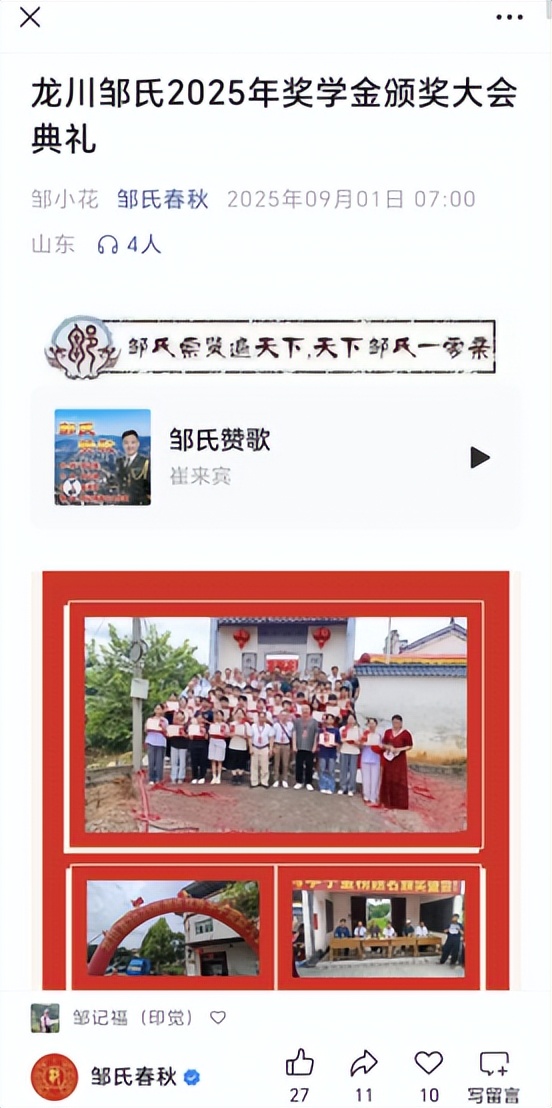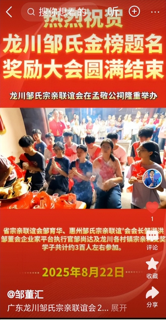 之前,我们已从互联网上看到:今年8月22日,在孟敬公祠举办了奖励龙川籍邹氏优秀学子暨参拜孟敬公祠仪式。看了该视频报道,我们深受族群精神感染。