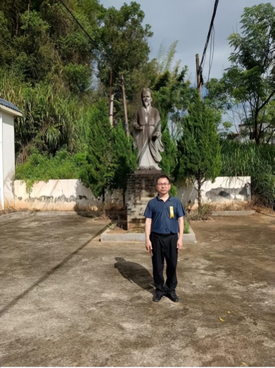 祠堂朝向的左侧2米多高围墙外地坪,一个约2米高青砖基座上,有仿真人大小中老年孟敬公站立石像,身穿宽袖汉服衣冠、右手托持开卷书本、腰际左手拇指掐中指计算、头部深思远眺、下颌有美胡子,让我倍感亲切。其身后几株翠柏现已4米多高,待若干年长得更高,风景必定更佳。